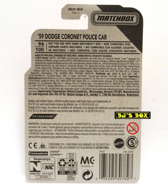 Tags: '59 DODGE CORONET, #94/100, 2020 Matchbox, Blue, MBX Countryside, New, Patrol, POLICE CAR, Vintage, White
